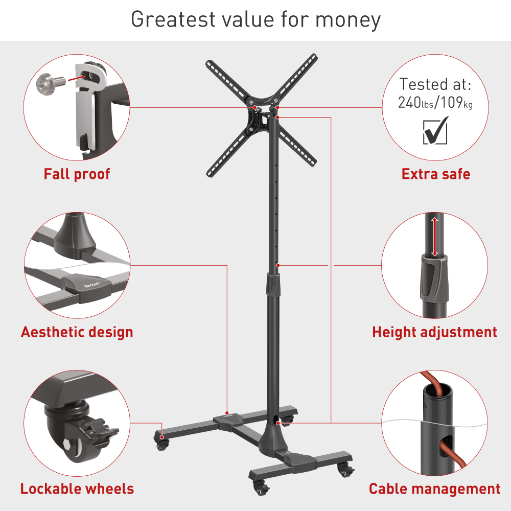 Introducing the Barkan 13″ – 65″ Tilt TV Cart, a practical and versatile solution for your TV display needs. Designed to accommodate TVs ranging from 13 to 65 inches, this TV cart offers a straightforward tilt feature for optimal viewing angles.